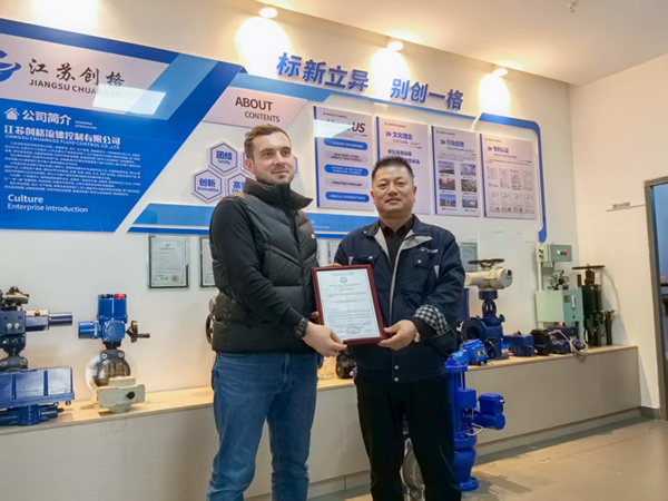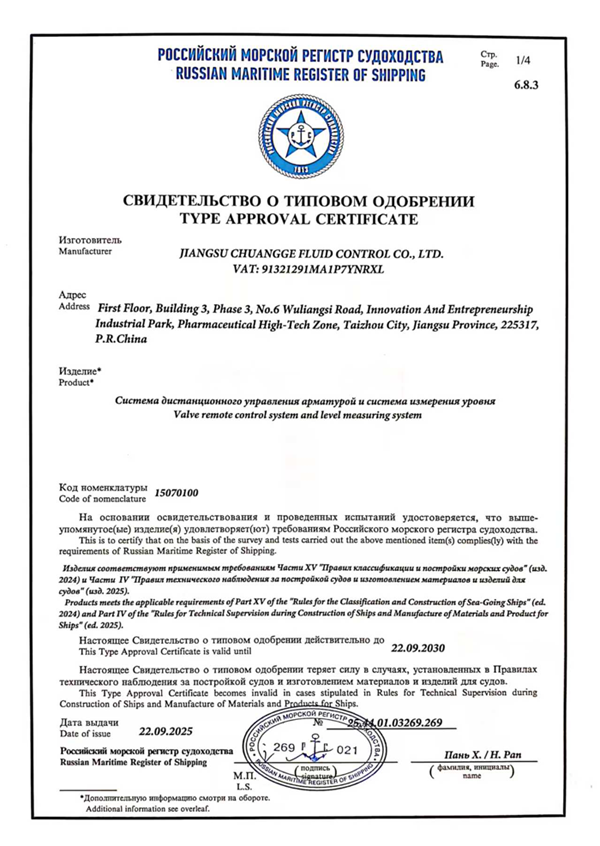 2025年6月,江苏创格流体控制有限公司顺利通过俄罗斯船级社(Russian Maritime Register of Shipping, RS)的严格审核,成功取得阀门遥控装置及液位遥测系统型式认可证书。昨日([具体日期]),俄罗斯船级社代表亲临公司,正式颁发认证证书,标志着公司流体控制产品在船舶及海洋工程领域的技术实力与国际合规性获得权威认可。